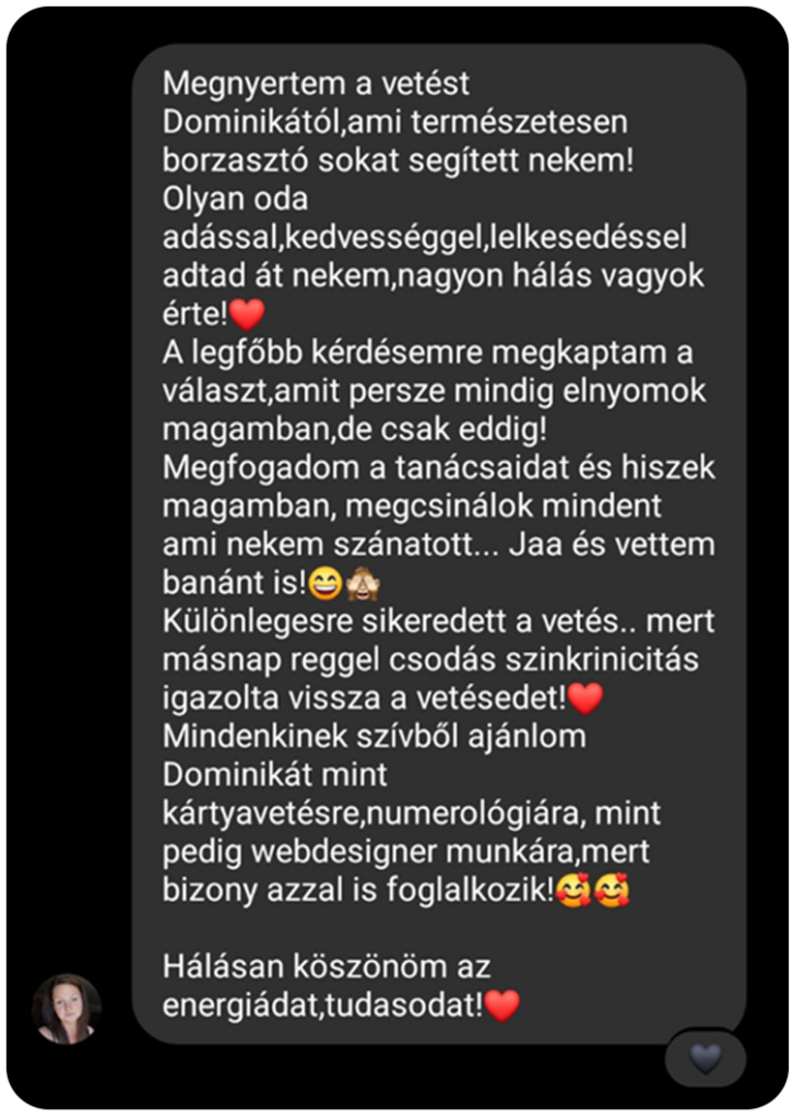 Jelenleg Numerológiával és Tarot kártyával foglalkozom - ezek olyan eszközök, amelyek segítenek mélyebben megismerni önmagad, felismerni a benned rejlő lehetőségeket, és ráláthatsz azokra a mintákra, amelyek akadályozzák a fejlődésed.