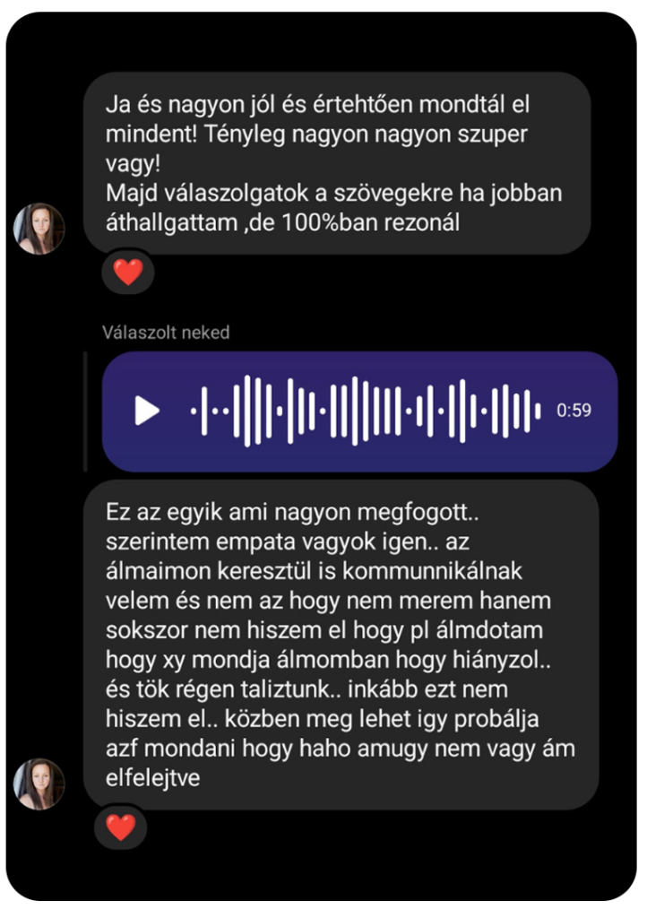 Az útmutatás alatt rád hangolódok. Itt ránézhetek a körülötted lévő energiákra, a benned rejlő blokkokra & kérdésekre. Ezáltal elindulhat egy belső blokkoldó folyamat Nálad. Az elemzéshez több kártyát használok és intuitívan csatornázom az üzeneteket Számodra.